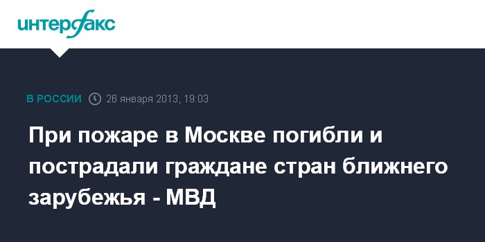 Москва. 26 января. INTERFAX.RU - Погибшие и пострадавшие при пожаре в здании на юго-западе Москвы, являются выходцами из стран ближнего зарубежья, сообщила в субботу вечером пресс-служба ГУ МВД по Москве. "По данным московской полиции, все погибшие и пострадавшие при пожаре люди являются гражданами ближнего зарубежья, работавшими на стройках столицы", - говорится в сообщении.