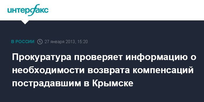 Москва. 27 января. INTERFAX.RU - Прокуратура Краснодарского края начала проверку по факту публикации в СМИ информации о том, что власти Крымска обязали пострадавших от наводнения в июле 2012 года возвратить часть выплаченных им компенсаций.
