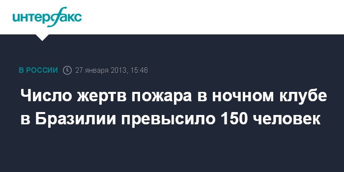 Бразилиа. 27 января. INTERFAX.RU - Опознаны тела 159 жертв пожара в ночном клубе в городе Санта-Мария, сообщил в воскресенье журналистам представитель полиции Жерсон да Роза Феррейра. По его словам, большинство жертв погибли от удушья или в давке, которая образовалась в результате пожара. Представитель полиции отметил, что общее число жертв, вероятно, превысит 200 человек.