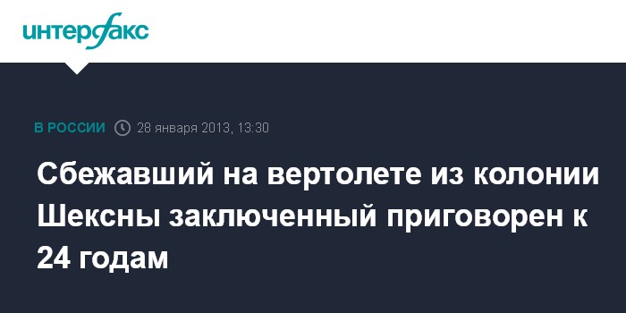 Вологда. 28 января. INTERFAX.RU - Вологодский суд приговорил заключенного Алексея Шестаков, сбежавшего в марте 2012 года из колонии в поселке Шексна на вертолете, к 24 годам лишения свободы, передал корреспондент "Интерфакса".