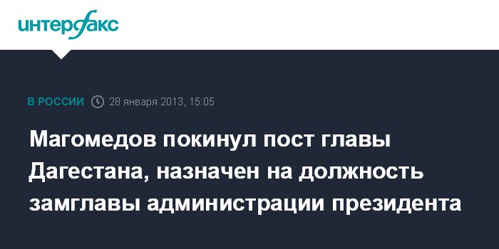 Исполняющим обязанности президента Дагестана Путин назначил Рамазана Абдулатипова. Еще одним указом глава государства назначил Магомедова заместителем руководителя администрации президента Российской Федерации.