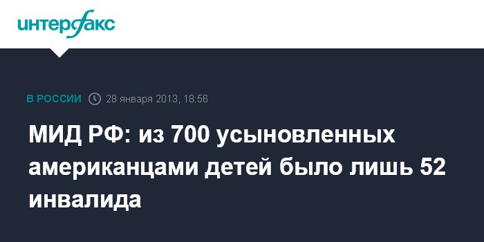 Так, отмечает Долгов, СМИ утверждают, что американские семьи в России усыновляли преимущественно детей-инвалидов. "Это не так, факты говорят об обратном: в 2012 г имело место 52 решения по усыновлению американскими гражданами ребенка-инвалида. Общее количество усыновленных американцами в нашей стране в том же году - около 700", - отметил в этой связи дипломат.