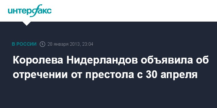 Гаага. 28 января. INTERFAX.RU - Королева Нидерландов Беатрикс в понедельник, выступая с телерадиообращением к подданным, объявила об отречении от престола в пользу наследного принца Виллема-Александера с 30 апреля.