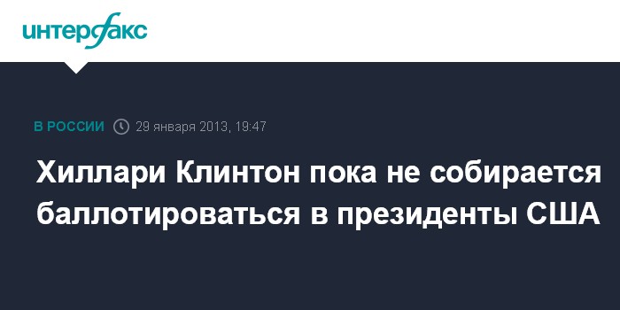 Вашингтон. 29 января. INTERFAX.RU - Госсекретарь США Хиллари Клинтон заявила, что в данный момент не планирует принимать решение по поводу возможности выступить кандидатом в президенты США на выборах в 2016 году. "На данный момент я не думаю об этом", - сказала Клинтон, отвечая на вопрос о том, собирается ли она побороться за Белый дом.