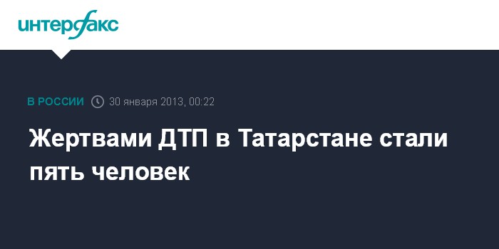 Москва. 30 января. ИНТЕРФАКС - Пять человек погибли, еще один пострадал при лобовом столкновении двух легковых автомобилей в Татарстане, сообщили "Интерфаксу" в ГУ МЧС России по республике.
