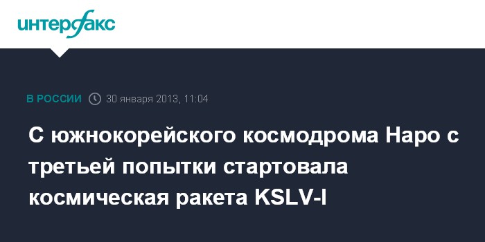 Москва. 30 января. INTERFAX.RU - Южнокорейская ракета космического назначения KSLV-I (The First Korean Space Launch Vehicle), первая ступень которой разработана и построена российским центром имени Хруничева, стартовала с космодрома Наро (Южная Корея), сообщил "Интерфаксу" представитель Роскосмоса.