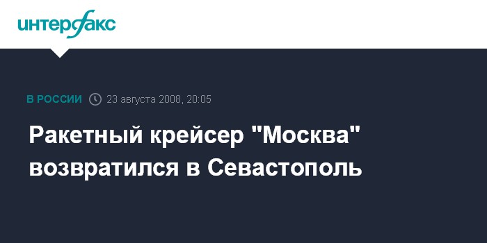 Москва. 23 августа. ИНТЕРФАКС - Флагман Черноморского флота РФ ракетный крейсер "Москва" возвратился в Севастополь после выполнения миротворческих задач у берегов Абхазии, сообщил журналистам помощник главкома ВМФ России капитан первого ранга Игорь Дыгало.