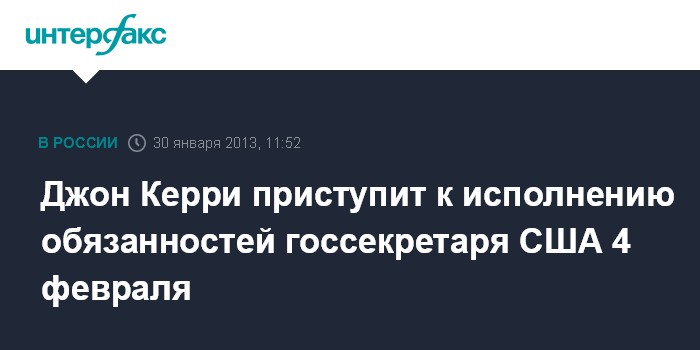 Вашингтон. 30 января. INTERFAX.RU - Сенатор-демократ Джон Керри, утвержденный Сенатом США в качестве нового главы государственного департамента Соединенных Штатов, приступит к исполнению своих обязанностей в предстоящий понедельник, 4 февраля, сообщило информированное американское издание Foreign Policy.
