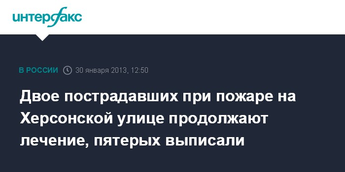 Москва. 30 января. INTERFAX.RU - Пятеро пострадавших в результате крупного пожара в субботу на Херсонской улице в Москве выписаны из больниц, еще двое продолжают стационарное лечение, сообщил "Интерфаксу" источник в медицинских кругах столицы.
