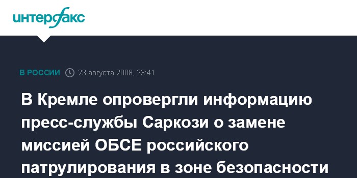 Москва. 23 августа. ИНТЕРФАКС - В пресс-службе Кремля не подтвердили информацию пресс-службы французского президента о том, что Дмитрий Медведев и Николя Саркози договорились о замене миссией ОБСЕ российского патрулирования в зоне безопасности за пределами Южной Осетии.
