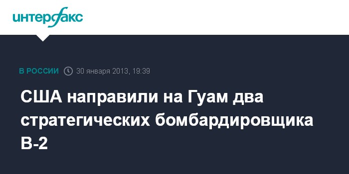 Вашингтон. 30 января. INTERFAX.RU - Пентагон направил на американскую авиабазу "Андерсен" на британском острове Гуам в Индийском океане два стратегических бомбардировщика-невидимки В-2.