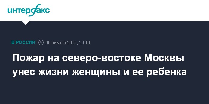 Москва. 30 января. INTERFAX.RU - Женщина и ребенок погибли в результате пожара на северо-востоке Москвы, сообщил "Интерфаксу" источник в правоохранительных органах.