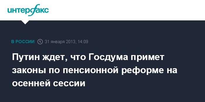Москва. 31 января. INTERFAX.RU - Президент РФ Владимир Путин призвал Госдуму в начале осенней сессии принять законы, касающиеся реформы пенсионной системы.