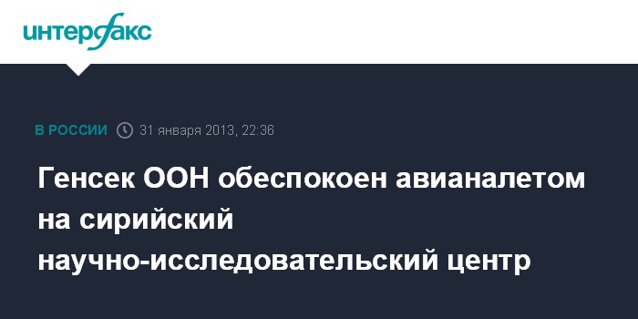 Нью-Йорк (ООН). 01 февраля. INTERFAX.RU - Генсек ООН Пан Ги Мун выразил серьезную озабоченность авиаударом ВВС Израиля по сирийскому научно-исследовательскому центру, находящемуся в пригороде Дамаска, заявил пресс-секретарь ООН Эдуардо дель Буэй в четверг.