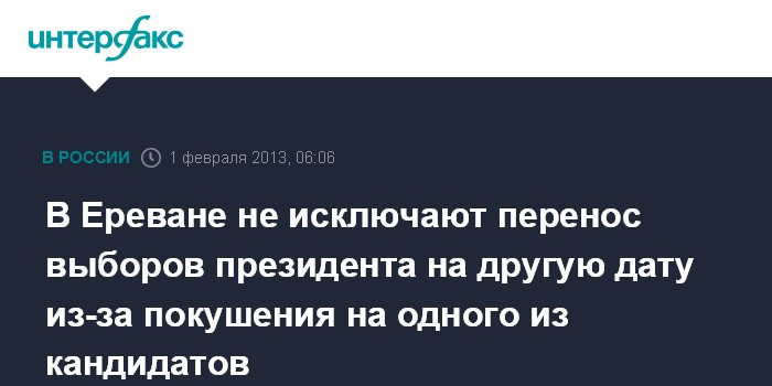 Ереван. 1 февраля. ИНТЕРФАКС - Спикер парламента Армении Овик Абраамян не исключил возможности отсрочки президентских выборов из-за совершенного покушения на одного из кандидатов в президенты Паруйра Айрикяна.