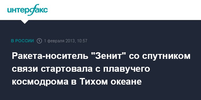 Королев (Московская область). 1 февраля. INTERFAX.RU - Ракета-носитель "Зенит-3SL" со спутником связи Intelsat-27 стартовала в пятницу в 10:56 МСК по программе "Морской старт" с плавучей стартовой платформы Odyssey из экваториальной части Тихого океана, передает корреспондент "Интерфакса-АВН" из Центра управления полетами Ракетно-космической корпорации (РКК) "Энергия".