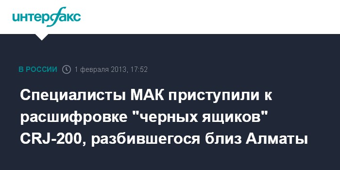 Алматы. 1 февраля. INTERFAX.RU - В Межгосударственный авиационный комитет доставлены бортовые самописцы с пассажирского самолета CRJ-200, потерпевшего крушение близ Алматы.