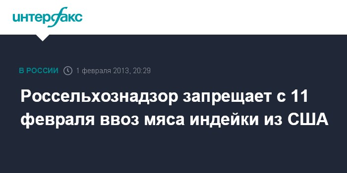 Москва. 1 февраля. ИНТЕРФАКС - Россельхознадзор принял решение о запрете с 11 февраля 2013 г.поставок мяса индейки из США из-за рактопамина.