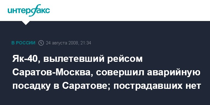 Саратов. 24 августа. ИНТЕРФАКС-ПОВОЛЖЬЕ - Самолет Як-40 ОАО "Саратовские авиалинии", вылетевший рейсом Саратов-Москва в воскресенье в 19:30 мск, совершил аварийную посадку в аэропорту Саратова.