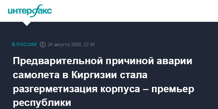 Бишкек. 24 августа. ИНТЕРФАКС - По предварительным данным, причиной аварии авиалайнера Боинг-737, потерпевшего крушение под Бишкеком, стала разгерметизация корпуса самолета, заявил премьер-министр страны Игорь Чудинов.