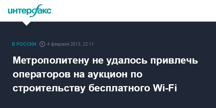 Москва. 4 февраля. ИНТЕРФАКС-ТЕЛЕКОМ - Операторы "большой сотовой тройки" - ОАО "Мобильные Телесистемы" (МТС), ОАО "Мегафон" и ОАО "Вымпелком" - не стали подавать заявки на участие в аукционе на строительство бесплатной сети Wi-Fi в метрополитене. Срок подачи заявок истек в понедельник.