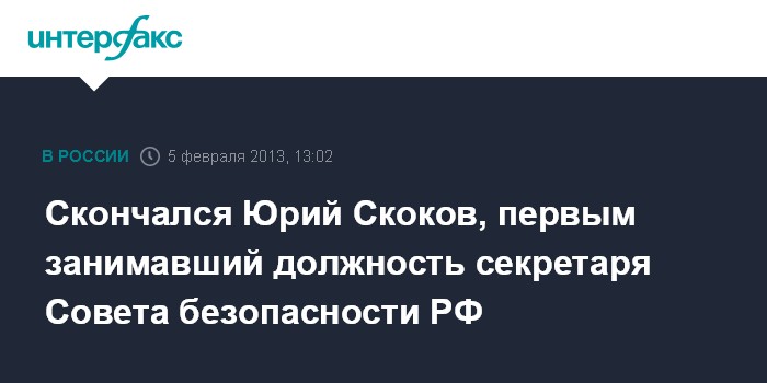 Москва. 5 февраля. INTERFAX.RU - Бывший секретарь Совета безопасности РФ (1992-93 гг.) Юрий Скоков скоропостижно скончался во вторник утром на 75-м году жизни.