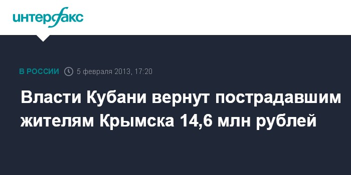 Власти Кубани вернут пострадавшим жителям Крымска 14,6 млн рублей