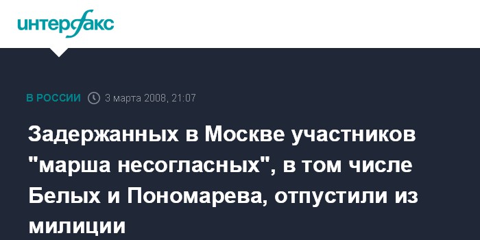 Москва. 3 марта. ИНТЕРФАКС - Лидер СПС Никита Белых и правозащитник Лев Пономарев освобождены после задержания в связи с их участием в несанкционированном "марше несогласных" в Москве.