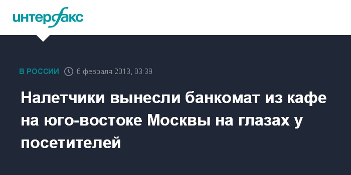 Москва. 6 февраля. ИНТЕРФАКС - На юго-востоке Москвы совершено дерзкое нападение, в результате которого неизвестные похитили банкомат одного из коммерческих банков в помещении кафе "Сабвей".