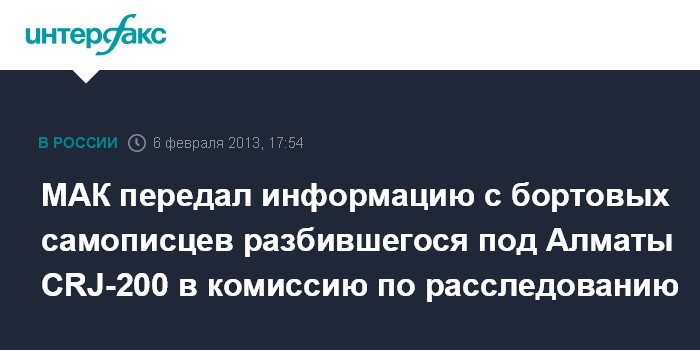 Алма-Ата. 6 февраля. INTERFAX.RU - Межгосударственный авиационный комитет (МАК) завершил расшифровку "черных ящиков" разбившегося под Алматы пассажирского самолета CRJ-200 и передал информацию в комиссию по расследованию.