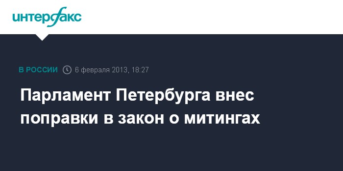 Санкт-Петербург. 6 февраля. INTERFAX.RU - Парламент Петербурга на заседании в среду принял во втором чтении законопроект о внесении изменений в городской закон "О собраниях, митингах, демонстрациях, шествиях и пикетированиях", сообщила пресс-служба палаты.