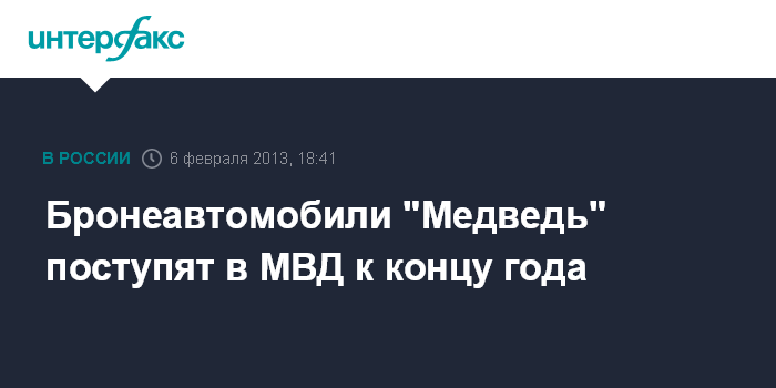 Он отметил, что в настоящее время опытный образец бронеавтомобиля "Медведь" находится в районе Сыктывкара на испытаниях в условиях низких температур после доработки по результатам предыдущих испытаний. "Завершающим этапом проводимых госиспытаний станут испытания автомобиля на подрыв", - добавил Суворов. По его словам, завершение государственных испытаний "Медведь" планируется на апрель-май 2013 года.