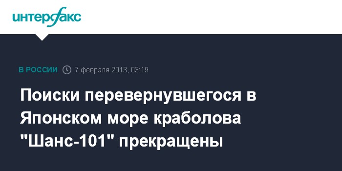 Южно-Сахалинск. 7 февраля. ИНТЕРФАКС-ДАЛЬНИЙ ВОСТОК - Спасательный буксир "Атлас" СахБАСУ не нашел в Японском море перевернувшийся краболов "Шанс-101" и сейчас находится в сахалинском порту, сообщили агентству "Интерфакс - Дальний Восток" в морском спасательном подцентре (МСПЦ) "Южно-Сахалинск".