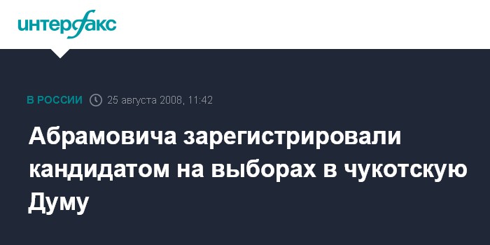 Хабаровск. 25 августа. INTERFAX.RU - Экс-губернатор Чукотского автономного округа (ЧАО) Роман Абрамович зарегистрирован избирательной комиссией региона в качестве кандидата на выборах в местную Думу.