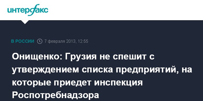 По словам Г.Онищенко, в списке - около 30 грузинских предприятий, на которые готовы выехать специалисты Роспотребнадзора. Г.Онищенко сообщил, что эти предприятий с 2008 года направляли в Роспотребнадзор документы, подтверждающие готовность начать поставки вина и минеральной воды в РФ.