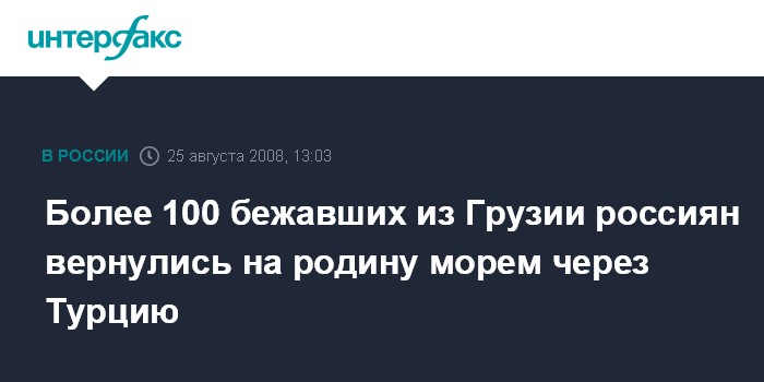 Москва. 25 августа. INTERFAX.RU - В Россию продолжают возвращаться российские граждане, остававшиеся до последнего времени в Грузии. "Чтобы возвратиться в Россию, многим приходится добираться морским путем через Турцию в Сочи", - сообщил агентству "Интерфакс" начальник пресс-службы Черноморско-Азовского пограничного управления береговой охраны ФСБ России Владислав Козлитин.