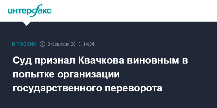 Москва. 8 февраля. INTERFAX.RU - Мосгорсуд признал виновным бывшего полковника Владимира Квачкова по делу о попытке организации вооруженного мятежа и содействии террористической деятельности.