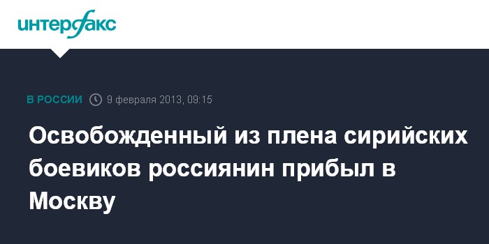 Москва. 9 февраля. INTERFAX.RU - Российский металлург Виктор Горелов, который находился в плену у сирийских боевиков почти два месяца, прилетел в субботу утром в Москву. Из столицы В.Горелов вечером отправится в родной город Новокузнецк.