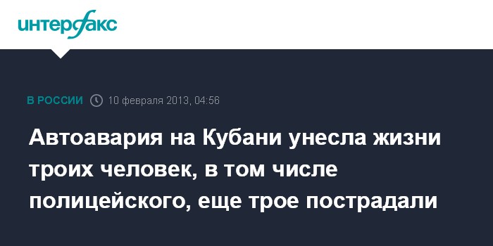 Ростов-на-Дону. 10 февраля. ИНТЕРФАКС-ЮГ - Жертвами дорожно-транспортного происшествия в Крымском районе Кубани стали три человека, среди которых сержант полиции, сообщили агентству "Интерфакс-Юг" в правоохранительных органах Крымского района.