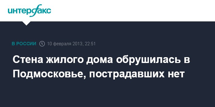 Москва. 10 февраля. ИНТЕРФАКС - Обрушение стены жилого дома с первого по третий этажи произошло в воскресенье в Пушкинском районе Подмосковья, сообщили в пресс-службе ГУ МВД по Московской области.