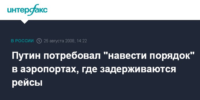 Москва. 25 августа. INTERFAX.RU - Премьер-министр РФ Владимир Путин потребовал от вице-премьера РФ Сергея Иванова, курирующего транспорт, сегодня же разобраться с ситуацией, связанной с задержками авиарейсов из российских аэропортов.