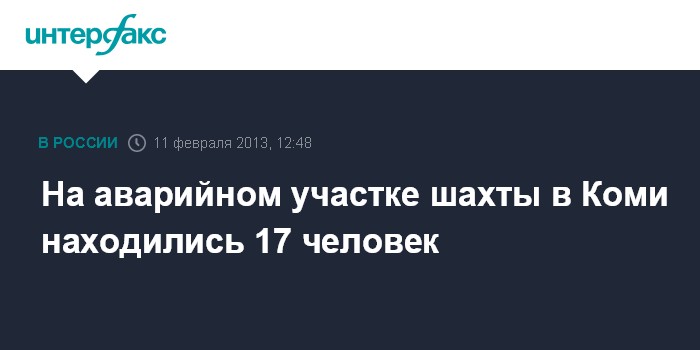 Сыктывкар. 11 февраля. INTERFAX.RU - На аварийном участке на шахте "Воркутинская" в Коми работало 17 человек, сообщили "Интерфаксу" в компании ОАО "Воркутауголь".