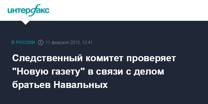 Москва. 11 февраля. INTERFAX.RU - Следственный комитет РФ начал доследственную проверку по факту разглашения журналистом "Новой газеты" Иреком Муртазиным данных предварительного следствия по уголовному делу в отношении братьев Олега и Алексея Навальных, сообщил "Интерфаксу" официальный представитель СК РФ Владимир Маркин.