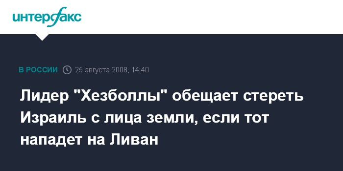 Бейрут. 25 августа. INTERFAX.RU - Лидер ливанского шиитского движения "Хезболла" Хасан Насралла поклялся стереть Израиль с лица земли, если войска этой страны нападут на Ливан.