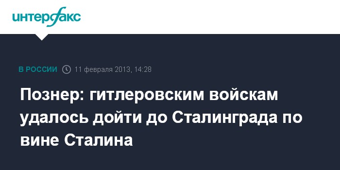 Москва. 11 февраля. INTERFAX.RU - Известный тележурналист Владимир Познер считает, что гитлеровским войскам удалось дойти до Сталинграда по вине Сталина, и в вопросе переименования нужно иметь ввиду историческое название Волгограда - Царицын.