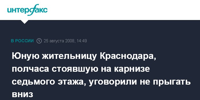 Краснодар. 25 августа. INTERFAX.RU - Жизнь 16-летней жительницы Краснодара, собиравшейся прыгнуть с седьмого этажа, вне опасности - сотрудники милиции отговорили ее сводить счеты с жизнью.