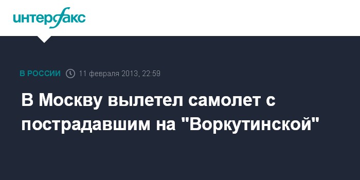 Москва. 11 февраля. INTERFAX.RU - Самолет МЧС России с пострадавшим при взрыве на шахте "Воркутинская" в Коми вылетел в Москву, сообщили "Интерфаксу" в управлении информации ведомства в понедельник.