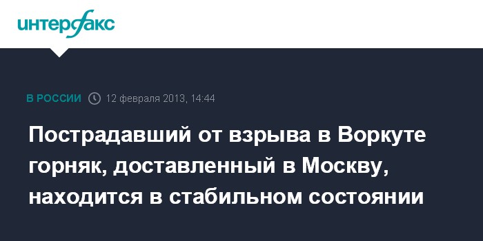 Москва. 12 февраля. INTERFAX.RU - Состояние пострадавшего на шахте "Воркутинская", доставленного в московский Институт имени Вишневского, стабильное, заявил журналистам главный врач института Валерий Кубышкин. "Состояние пострадавшего стабильное. По динамике показателей хочется надеяться, что прогноз благоприятный", - сказал Кубышкин.