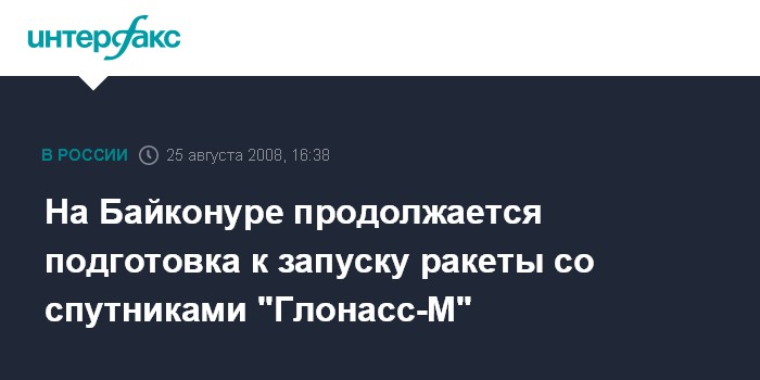Москва. 25 августа. INTERFAX.RU - На космодроме Байконур продолжаются работы по подготовке к запуску ракеты космического назначения "Протон-М" с разгонным блоком ДМ и тремя космическими аппаратами "Глонасс-М".