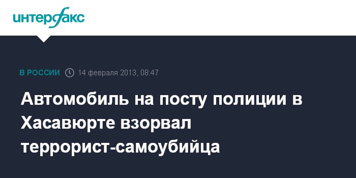 Махачкала. 14 февраля. INTERFAX.RU - По предварительным данным, атаку на пост полиции в дагестанском Хасавюрте, в результате которой погибли три сотрудника полиции, осуществил террорист-самоубийца, сообщили "Интерфаксу" в пресс-службе МВД по Дагестану.